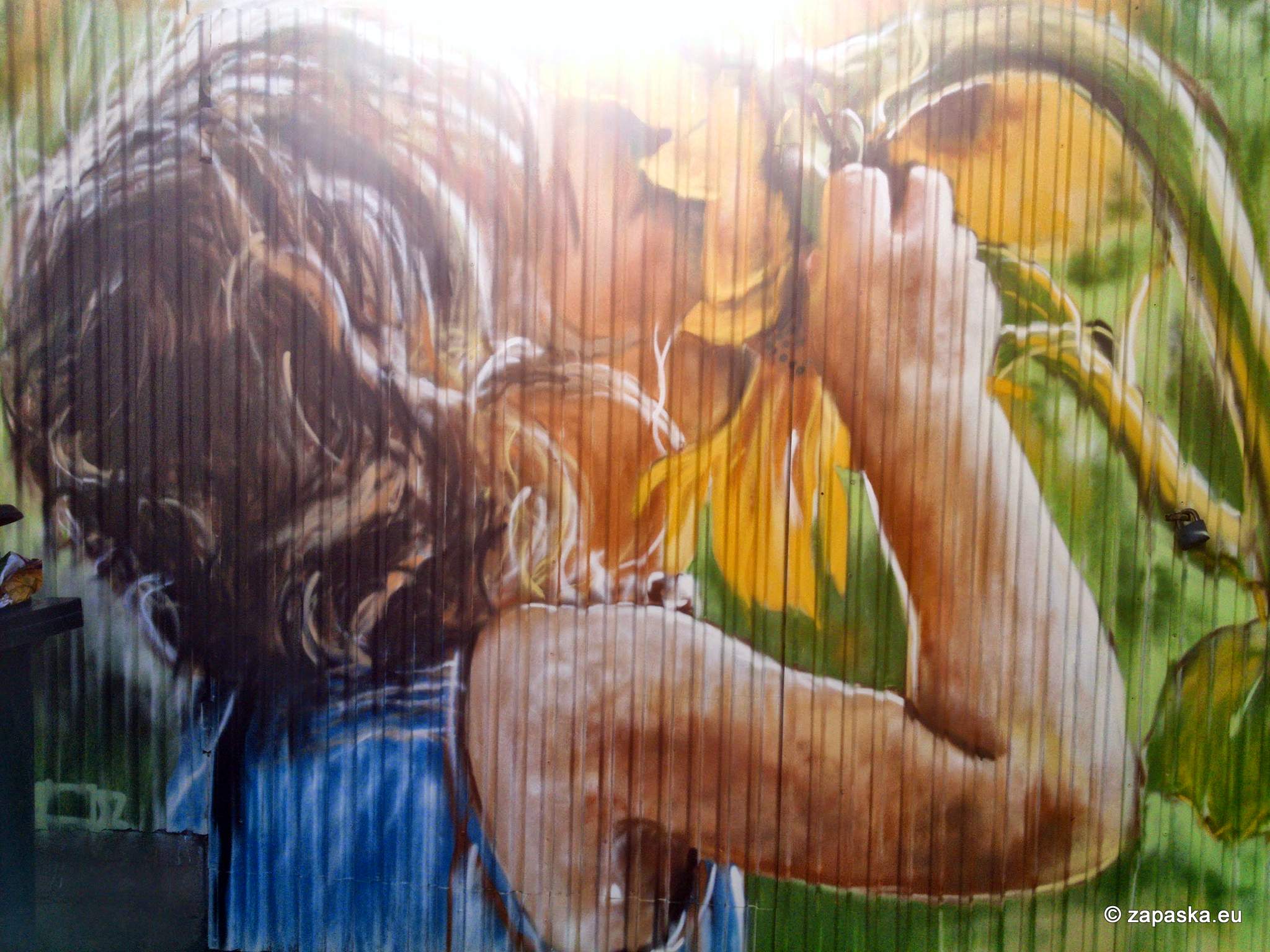 Malunek z pierwszych lat jego twórczości. U Arka w pracowni są oczywiście nie murale, tylko jego obrazy. Polecam, jeśli kiedykolwiek będziecie w okolicy, zajrzeć tam – to zupełnie coś innego niż to, co maluje w przestrzeni miejskiej czy wiejskiej. To nie są deskale.