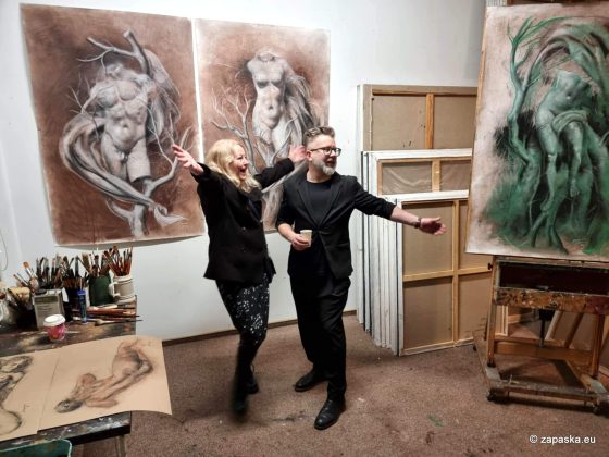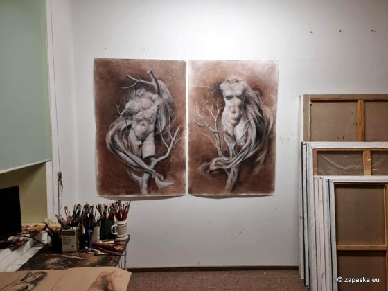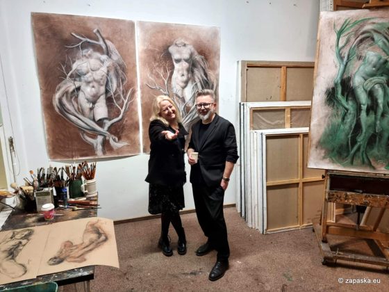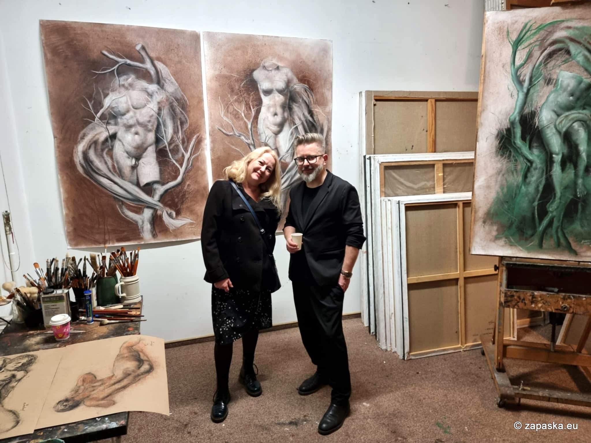 Najchętniej napisałabym o każdym z nich osobny tekst, bo widać w ich pracach progres, zmiany, nowe nuty artystyczne. Wspomnę tylko o Janie Szczepkowskim – niech się pozostali nie obrażą. Jan zaskoczył mnie nową formą swoich prac. On zawsze lubił ogromne przestrzenie, ale tym razem aż musiałam podejść do jego malunku i sprawdzić, na czym to właściwie jest narysowane. Bo wrócił do szkicowania. Zobaczycie na zdjęciach – to są wielkie rysunki, do których używa sepii, kredy i węgla. Patrząc na nie, miałam wrażenie, że gdzieś między kreskami widać echa dawnych mistrzów, trochę greckich rzeźb, trochę współczesnej zmysłowości. I pomyślałam sobie, że gdyby Fidiasz miał pod ręką węgiel, to mógłby mu pozazdrościć. Bardzo fajnie to wygląda.