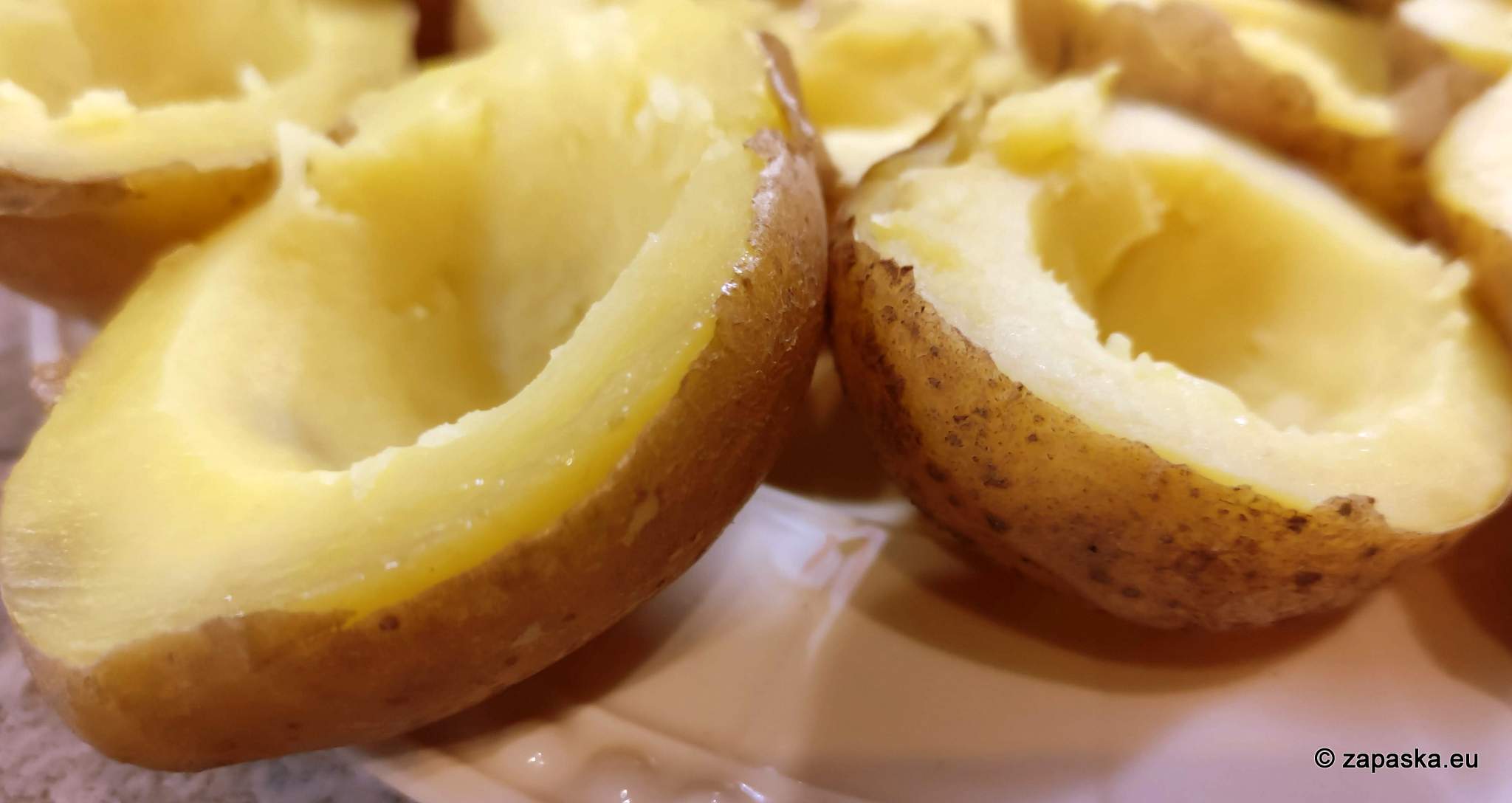 - Łódeczki: Gdy ziemniaki wystygną, przekrawamy je na pół i wyjmujemy część miąższu, tworząc łódeczki (miąższ można dać zjeść kumplowi z masłem i solą).